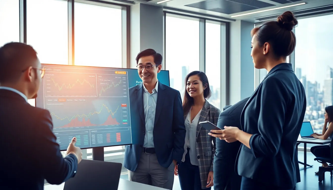 diverse team discussing cryptocurrency trading in a modern office.